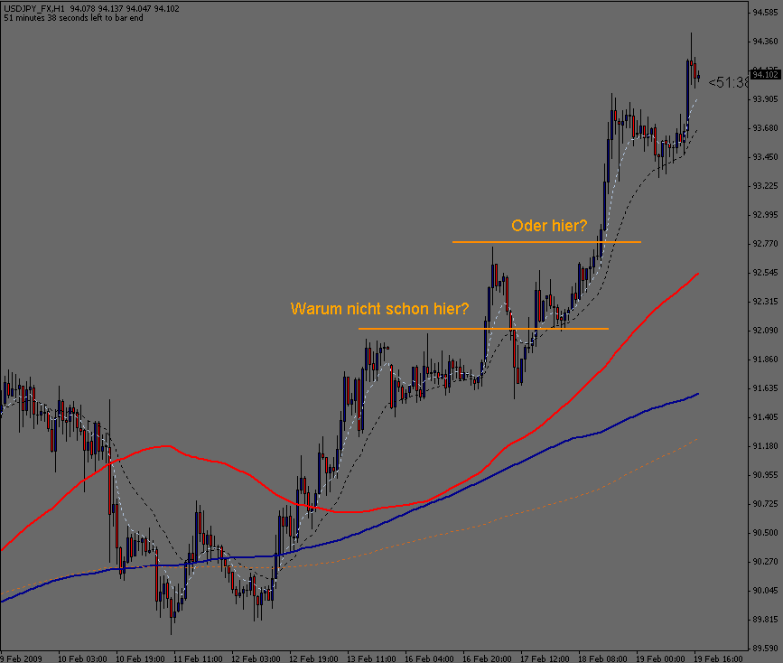 Wenn nun also auch eine Short Chance wartet, "soll man" nun beides gleichzeitig tun laut Autor? Long und Short? Welchen Vorteil bringt das im Vergleich zu einer Richtung, die man wählt? Oder Short erst, wenn wieder unter 94 und Long Stopp knapp unter 94? Welchen Zeithorizont hat man im Auge, welche Zielmarke(n)? Tag, Woche, Monat? Wenn 92 gleich Zielmarke short, dann 96 gleich Zielmarke Long oder wie geht der Autor vor? Wo sind die Stopps, wenn man gleichzeitig drinnen ist? Sind Stopp und Zielmarke von Long und Short jeweils gleich groß? Nee oder? Wäre man ja wieder bei +/-0 bei exaktem Eintreffen eines Falles. Oder gar keine Stopps? Warum gerade erst jetzt bei 94 long, wo doch knapp darüber ein etwas stärkerer mehrfacher Widerstand wartet, der das Risiko eines Abprallers erhöht? Oder liegt dort das Ziel? Wenn es um einen Breakout geht (so hat es ja den Anschein), dann hätte man diesen doch schon viel früher ins Auge fassen können (zwei Breakout-Beispiele unten). Warum seit gestern oder vorgestern gerade 94 als späten Einstieg erwähnt?