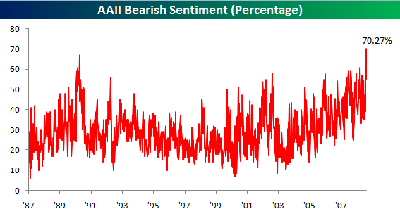 Below we highlight the percentage of stocks trading above their 50-day moving averages in the S&P 500 and its ten sectors. As shown, 5% of stocks in the S&P 500 are still trading above their 50-days, so we still have further to go before we get to zero. Three sectors -- financials, industrials, and utilities -- have zero stocks trading above their 50-days. Technology has the highest percentage of stocks above their 50-days at just 12%!