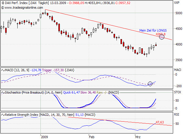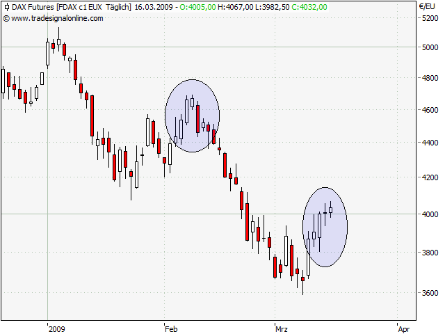 Die Mehrheit der Marktteilnehmer verfährt noch immer nach der Methode schneller Gewinnmitnahmen, angesichts von Zugewinnen in einzelnen Titeln von mehr als 35 Prozent in wenigen Tagen absolut nachvollziehbar. Kann der kurzfristige Aufwärtstrend in den nächsten Tagen aber verteidigt werden, könnte sich im DAX eine mittelfristige Umkehrformation mit zwei Tiefpunkten entwickeln. Das daraus entstehende Aufwärtspotential könnte den Bullen mindestens noch einmal den gleichen Umfang an Zugewinnen bescheren wie in den vergangenen Tagen. Aufgrund der Marktentwicklung in den vergangenen Monaten bleibt aber für viele Investoren Vorsicht die Mutter der Porzellankiste. Noch müssen die vergangenen vier Handelstage als normale Bärenmarktrallye bewertet werden.