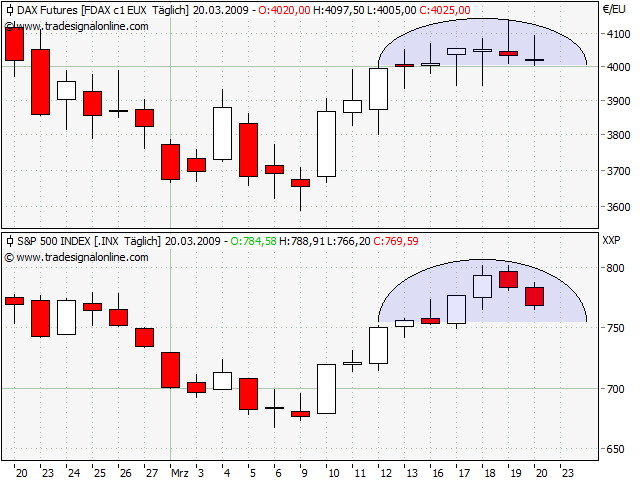 Swenlin sieht die Widerstandslinien im SPX als nicht nachhaltig genug überschritten an, um die durch das Fed-Announcement losgetretene Rally fortzusetzen. Der Markt ist "extremly overbought" und eine bevorstehende Korrektur ist als sehr wahrscheinlich anzusehen. Der Kursanstieg in den zurückliegenden Tagen hat den Bullen zwar einiges an Stärke zurückgegeben, Swenlins Erwartungen bleiben aber weiterhin bärisch.