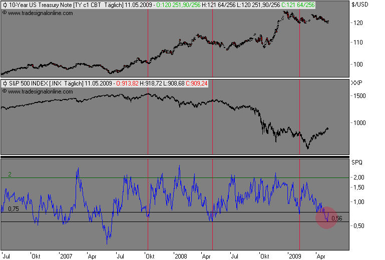 Der US-T-Bond-Future musste zuletzt die Schlüsselunterstützungen in Form des Hochs vom 16. September bei 124 24/32, der immer noch steigenden 200-Tages- Linie (akt. bei 124 20/32), dem Tief vom 27. Februar bei 124 11/32 und dem 61,8%- Fibonacci-Retracement (124 06/32) preisgeben. Das Abgleiten unter dieses Haltebündel hat seine Wirkung nicht verfehlt: In der Folge ging es für das Rentenbarometer eine ganze "Etage" tiefer. Derzeit versucht der Rentenfuture eine zaghafte Stabilisierung auf Basis verschiedener Hochpunkte bei rund 120. Die technischen Indikatoren deuten eine kurzfristige Übertreibung nach unten an. So stabilisiert sich derzeit der Stochastik in seiner unteren Extremzone. Einen Schritt weiter ist dagegen bereits der RSI, der zuletzt den überverkauften Bereich wieder nach Norden verlassen hat. Selbst der Blick auf den MACD weckt die Hoffnungen der Rentenmarktbullen, zeigt der Trendfolger doch eine divergente Entwicklung, indem die jüngsten Kurstiefs nicht mehr durch entsprechende Pendants im Indikatorverlauf bestätigt wurden.