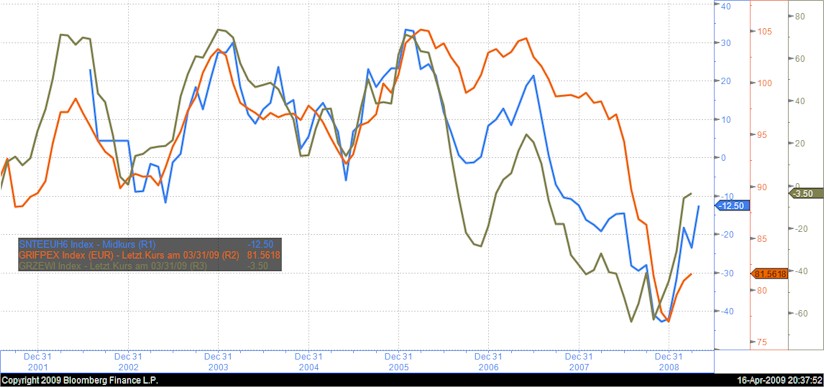 Der Gesamtindex für Euroland steigt um 14,3 Indexpunkte auf -17,0 Punkte und hat damit seit seinem Allzeit-Tief vom März 2009 bei -42,7 Indexpunkten wieder 25,7 Punkte zugelegt.