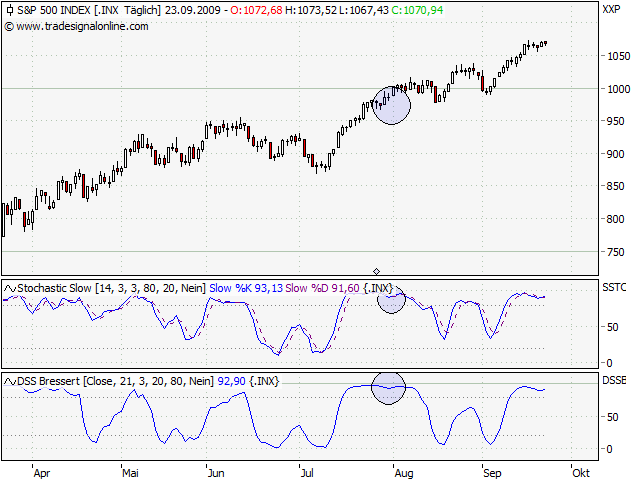 Gestaffelte Einstiege antizyklisch, daß bringt selten etwas, egal ob Long oder Short. Da habe ich lieber die Geduld und achte darauf, die Grenzen auszuloten. Die nachfolgenden Trends sind meist effektiver und es ist nicht so, daß man 2009 nichts mit Short verdienen konnte. Im Gegenteil. Richtig ist aber, daß die Shortsignale seit März/April eher Fehlsignale waren als vorher. Macht aber nichts, weil man es einfach vorher nicht weiß, welches Signal paßt und welches nicht. Somit kann nur die Gesamtheit der Signale einen passenden Handelsertrag möglich machen.