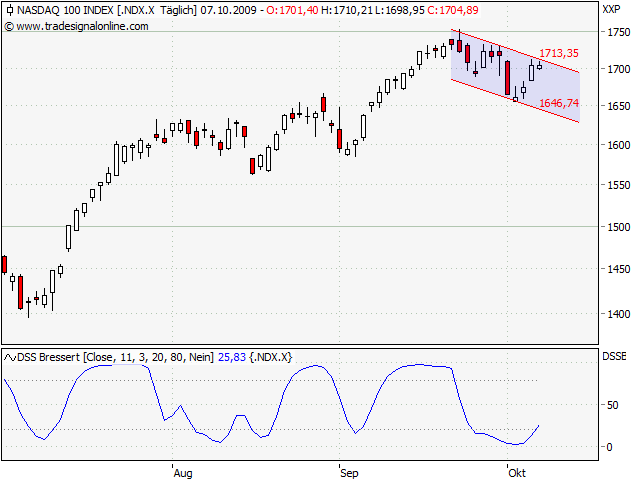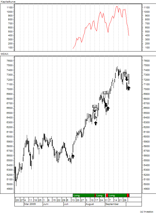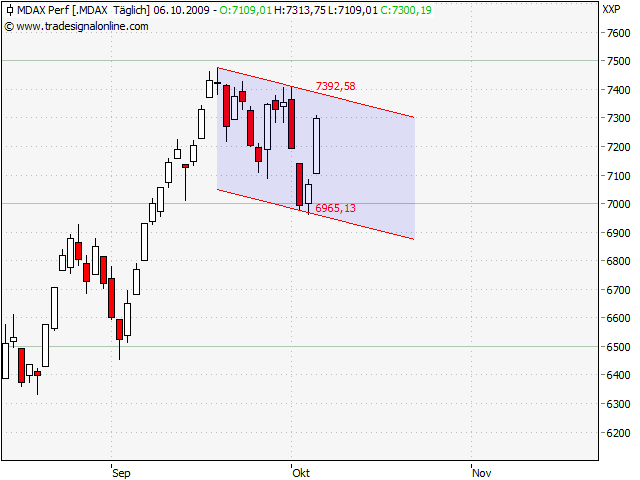 Aber die Tatsache, dass die Abwärtsbewegung momentan komplett abgefangen wurde durch ein neues Moment nach oben, ist nicht zu leugnen. Ob das nur eine Korrektur eines überschießenden Abwärtstrends war, sehen wir erst dann, wenn der MDAX an deinem Kurskanal oben abprallt. Dann, und genau dann, ist der Einstieg für short gegeben, und zwar zu einem ziemlich optimalen Zeitpunkt.