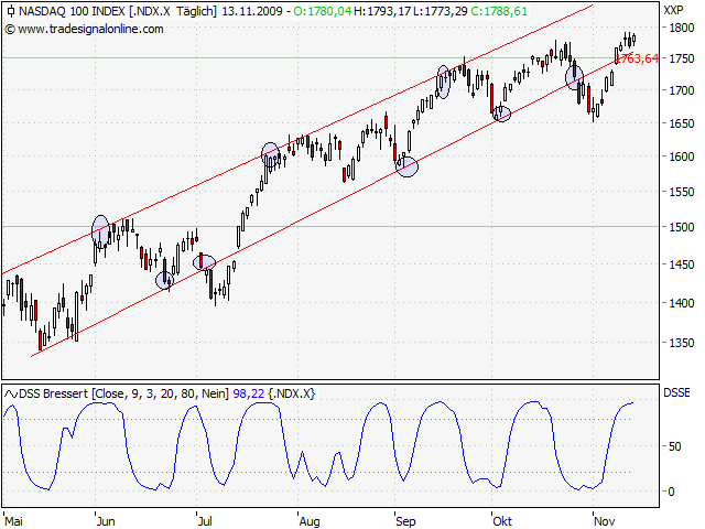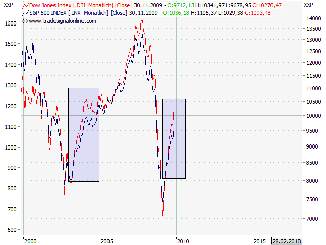 Bringe Selbstverständlichkeiten: Der eine Index steigt stärker, als der andere. Kann jeder nachprüfen, ob das wahr ist. Aber nicht einfach nachvollziehbar, sondern als Relativ-Chart – das wirkt weise. Mache ich ja auch ab und an… ;-)