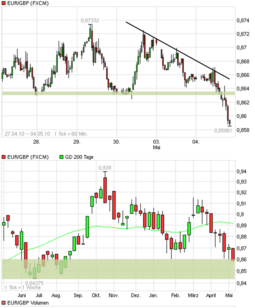 In den letzten Tagen sah es so aus, als würde Euroland wieder einen – und sei es aus Bärensicht temporären – Boden finden. Das Pärchen EUR/GBP konnte ab und an einen Hopser nach oben machen – immer im Rahmen der typischen Tagesbewegung: Erst hoch, dann wieder herunter. Und die 0,863 schien eine Unterstützung zu bieten. Auch wenn das jeweilige Tageshoch immer tiefer als das vorherige war. Gestern sah die Entwicklung gar nicht mehr so positiv aus, es grummelte in der Kiste. Heute gab es hektisches hin- und hergeschiebe, bis diese Unterstützung gerissen wurde. Jetzt ist der Weg frei bis cirka 0,84375, dem Tief Ende Juni.