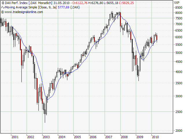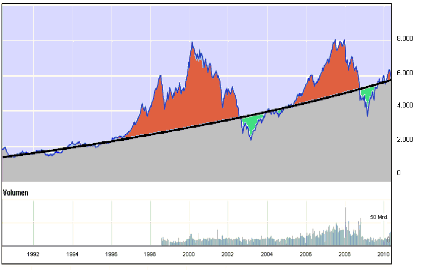 Diesen beiden Voraussetzungen folgend habe ich einen „normalisierten“ Index eine Verzinsung berücksichtigend rein gemalt. Interessant wäre im Vergleich dazu ein rein mathematisches Verfahren – habe keine Lust die Daten irgendwo runterzuladen und zu kucken, wie man über die Methode der kleinsten Quadrate in Excel auf ein Ergebnis kommt… Wer das am WE machen will – das wäre toll!