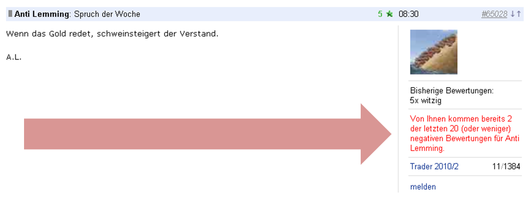 Der Chef von Marktkauf kommt und sagt mir ,,wir verkaufen immer die Tüten und die Anderen tun dies auch." Darauf sage ich, ,,dann habt ihr Alle einen an der Waffel und verarscht die Kunden, denn wenn ich 3 Tüten á 20 Cent brauche und der Kassierer 30 Tüten in der Stunde verkauft - weil er mir die Tüten noch nicht mal einpackt und somit Zeit spart - dann bezahlt der Kunde durch die Tüten den Kassierer und nicht der Laden. Also er kann sich das überlegen, entweder gibt er mir die Tüten umsonst, oder er kann die Tiefkühlprodukte wegschmeißen, weil sie seit über 15 Minuten als der Kühlkette sind, wenn er die Hygienevorschriften einhalten will." Er sagt nein, ich dreh mich um und sage gar nichts. Darauf hin rennt er neben mir her und sagt ,,ich müsste kaufen". Darauf sage ich zu ihm: ,,Zeigen sie mir den Vertrag den wir abgeschlossen haben." Er guckt mich an, die Leute auch.