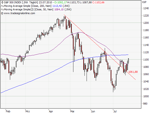 Oder anders ausgedrückt: Bin zurück aus dem Urlaub (war schön, danke der Nachfrage). Ich habe die Kurse aber täglich verfolgt und in Ermangelung eines Netzanschlusses notgedrungen recht viel N-Tv Telebörse geschaut. Was mir auffiel: Es lief exakt so wie vor 2 Wochen vorhergesagt: Die Bären waren zu sicher, wurden mit einem brutalen Upmove bis an SP 1100 abgestraft. Anschließend wurden die Bullen verprügelt. Diese Woche dann wieder umgekehrt.