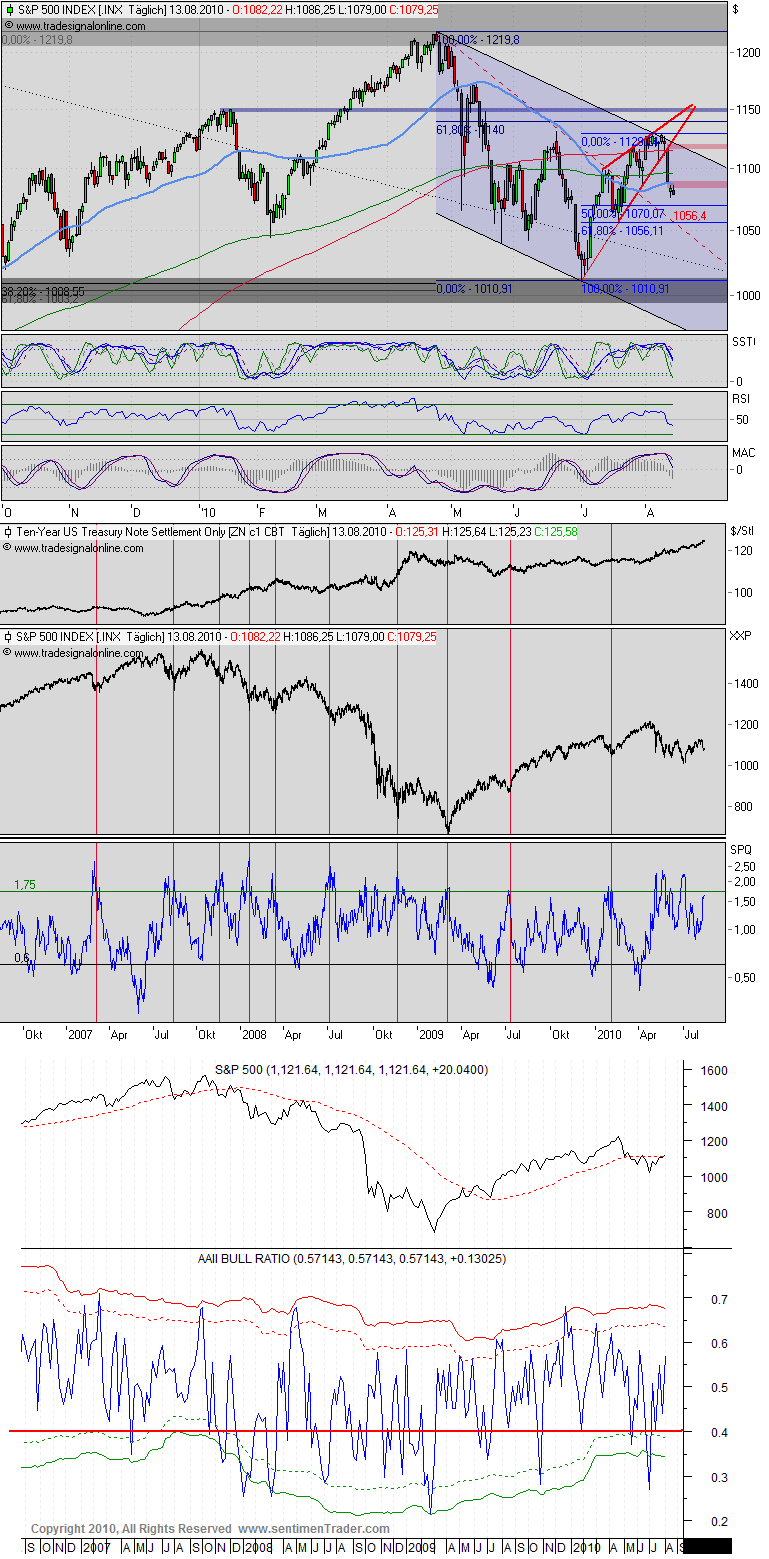 Wie geht es weiter? In den nächsten Tagen muss eingepreist werden, dass wohl QE2 anläuft. Das ist bullish, denn es hilft der Konjunktur. Bearisch jedoch ist, dass der Dollar durch das Gelddrucken fällt und der Schuldenstand der USA steigt.