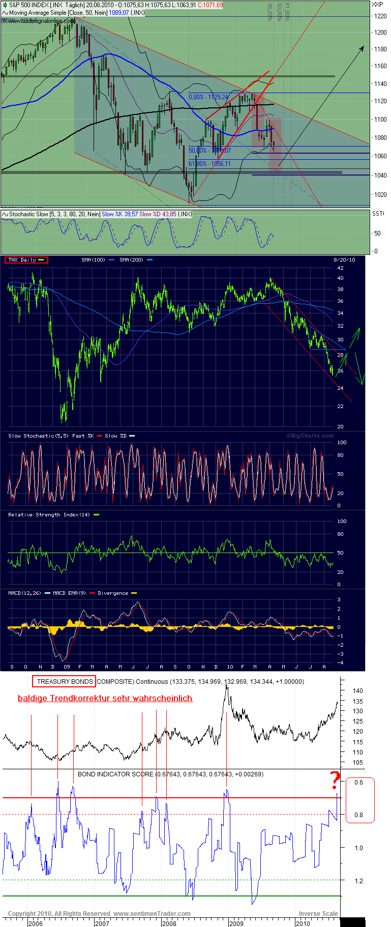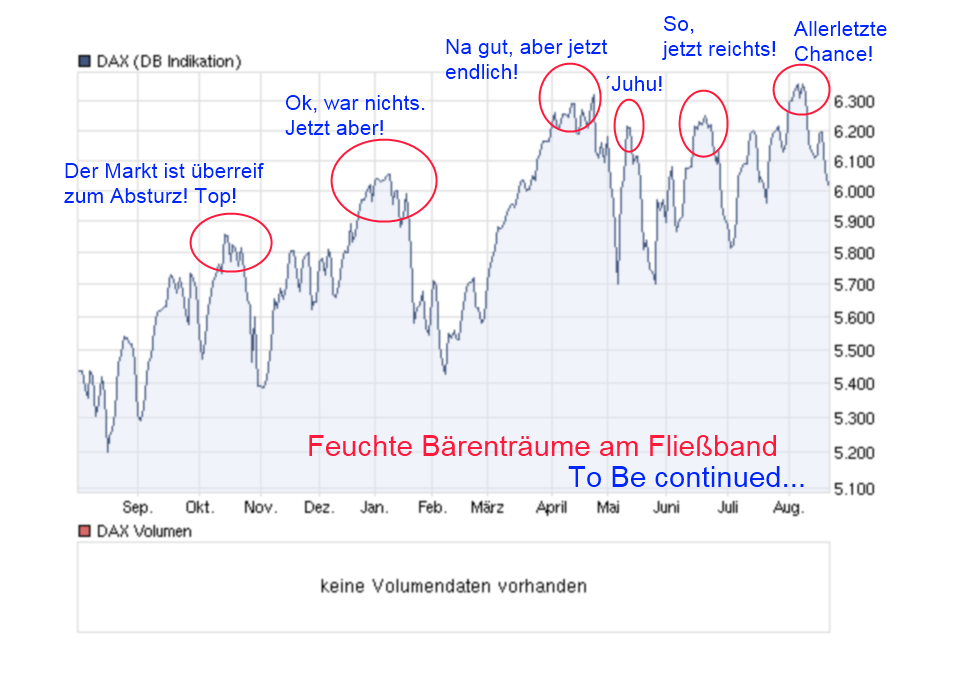 Aber Apaß beiseite. Ich glaube wir sind uns einig, dass der Markt an einer Schlüsselpostion (aus techn. Sicht) steht. Die Stärke der Bären haben wir gesehen (seit April!). Ich denke, dass man jetzt die Bullen bewerten sollte. Sie werden ihre Chance bekommen, ich denke sogar gleich am Montag. Es ist gut möglich, dass wir (ich?) an der Nase gerumgeführt wurden und der Markt demnächst völlig dreht. Wissen wir's? Nein. Und deshalb ist es sinnlos sich eine Meinung über die Zukunft zu bilden, denn wir haben keine Ahnung welche Sau durchs Dorf getrieben wird.