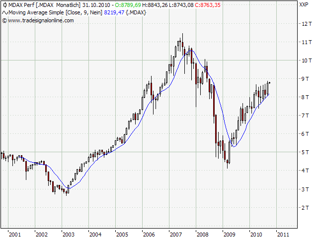 Das ein Handelssystem auf allen Zeitebenen funktionieren muss ist nicht mein Ziel und ich glaube das eine entsprechende Anforderung ein System zu kompliziert macht. Auf Stundenbasis über den Tag läuft ein Index manchmal mehrfach zwischen Bollinger innen und aussen hin und her. Sieh Dir mal einen monatelangen Anstieg der Indices in 2009 auf Tagesbasis an. Das untere Bollinger wird nur selten berührt.
