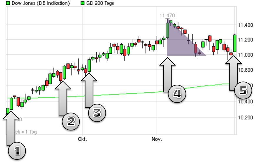 Die bzgl. Risiko/Ertrag optimale Strategie ist damit Long/Flat in der Hausse bzw. Short/Flat in der Baisse.