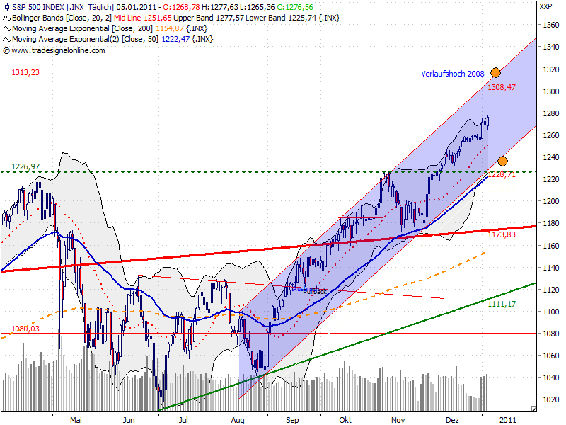 Auch temporäre Rücksetzer bis zum mBB bei der 1251 würde die aktuelle Rally nicht gefährden. In Anbetracht der Trendstärke ist davon auszugehen, dass der SP vor einer größeren Konsolidierung erst wieder die Oberkante des Aufwärtstrendkanal testet, bei derzeit 1308. Bei ca. 1314 wartet zudem ein größeres Verlaufshoch aus Mitte 2008, was die Rally eindämmen könnte.