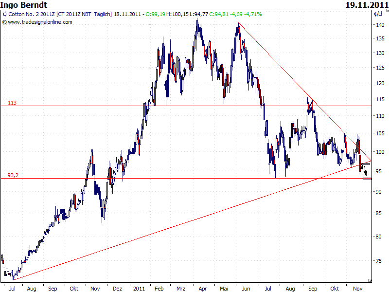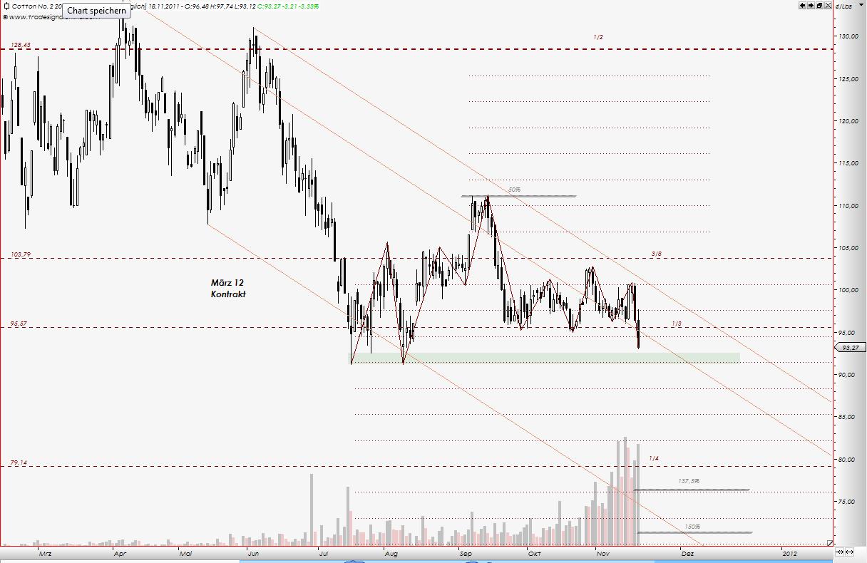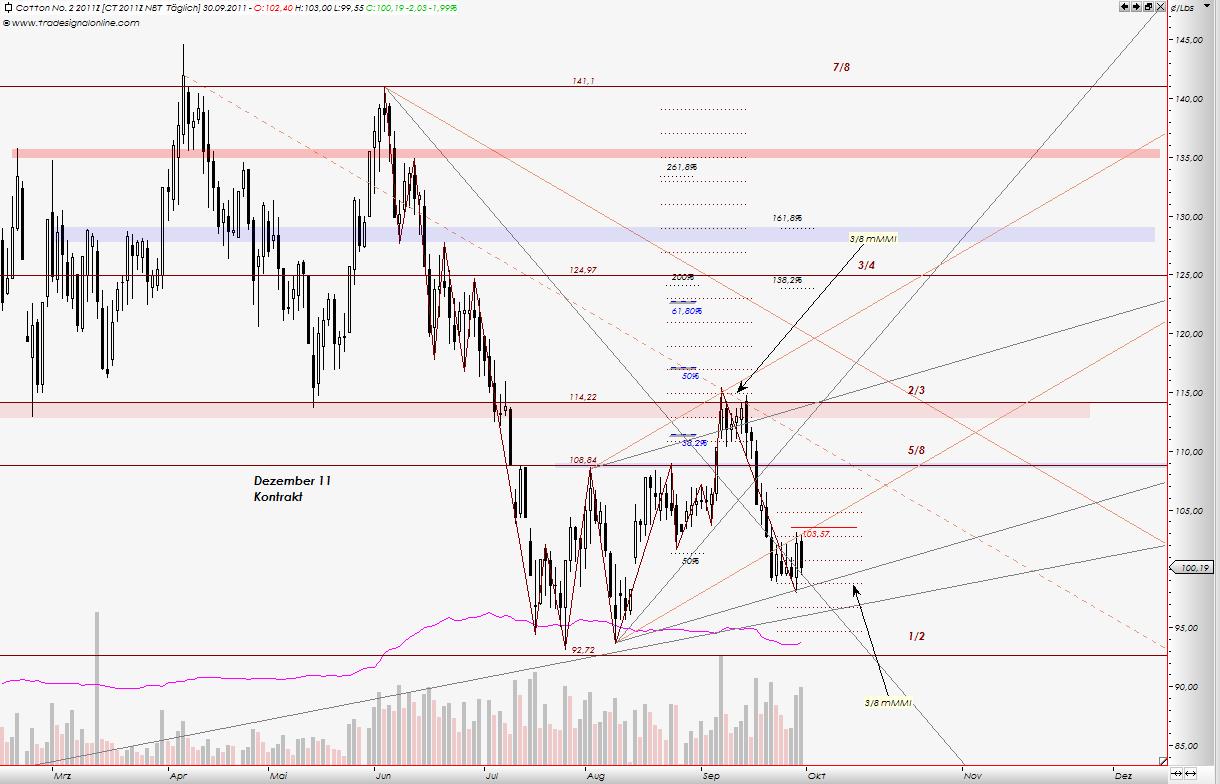 Du siehst, dass im Bereich von 115 zwei dieser Linien sich treffen. Darüberhinaus verläuft in diesem Bereich die 2/3 Gann Linie und gleichzeitig wurden in diesem Bereich Tiefs im Februar und Mai gemacht. Deswegen, wenn endlich Ausbruch nach oben kommt, halte diesen Preis als Kursziel 1. Automatisch werde ich aber dort nicht gleich rausgehen, sondern lediglich die Stops anpassen, denn wenn 115 bricht, ist dann Ziel 2 an der Reihe. Dort wiederrum zwei Winkellinien die sich treffen, die nächste Gann Linie, mehrere Fibonacci Retraccements und vor allem im Wochenchart verläuft dort die 1*1 abwärts führende Winkellinie. Aber auch dort werde ich nicht gleich Long glatt stellen, sondern die Stops anpassen, denn so lange ein Trend am laufen ist, bleibe ich in der Position, erst wenn dieser droht zu drehen, bereite ich mich auf neue Position, also dann auf Short zu drehen.