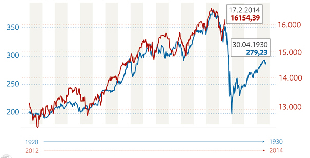 Der Chart zeigt eine erschreckende Parallele: Zunächst ging es von Anfang 1928 bis zum September 1929 ähnlich steil nach oben wie heute. Dann kam der brutale Absturz. Schon im November 1929 war der amerikanische Dow Jones Index, der im Oktober sein Hoch bei 381 Punkten erreicht hatte, nur noch halb so viel wert.