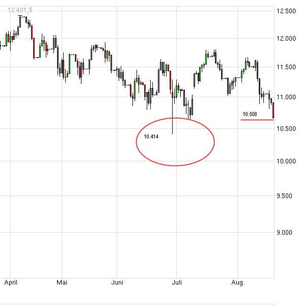 Gleich wieder abwärts geht es zum Handelsstart in den Dax-Futures am Morgen. Der Kontrakt bricht auf den tiefsten Stand seit Februar und damit ein neues Halbjahres-Tief. Der September-Kontrakt des Dax-Futures verliert gegen 8.06 Uhr 54 auf 10.620,5 Punkte. Das Tageshoch liegt bislang bei 10.658 und das Tagestief bei 10.585,5 Punkten. Vorbörslich verliert der Dax 1,0 Prozent.