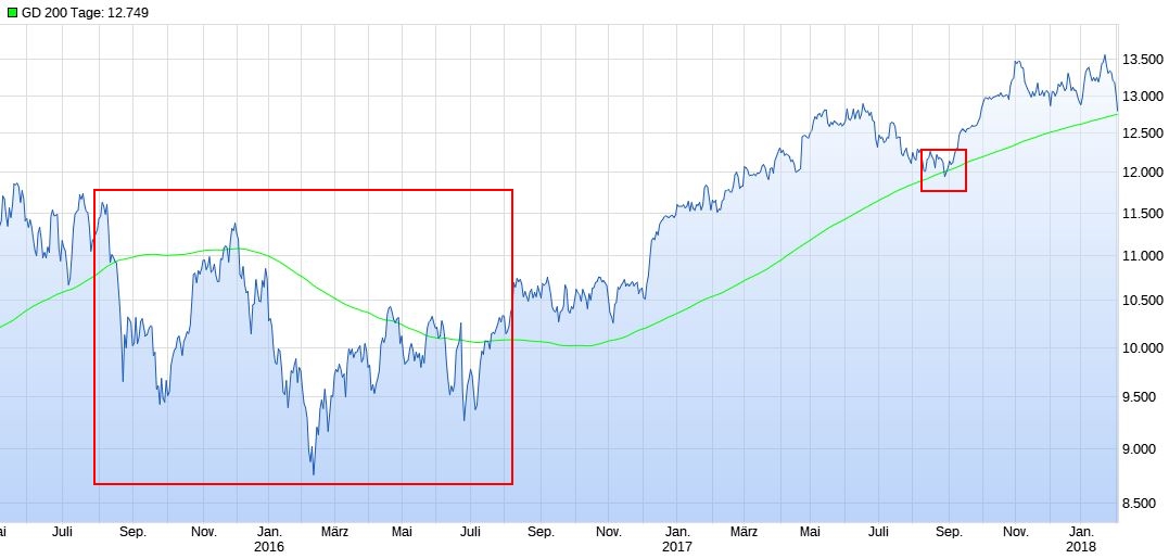 Die 200-Tages-Linie liegt heute bei 12.749 Punkten, ist also in greifbarer Nähe. Das letzte Mal als der Dax die Linie unterschritt, handelte es sich um ein Fehlsignal. Beim vorletzten Mal folgte eine längere Korrektur.