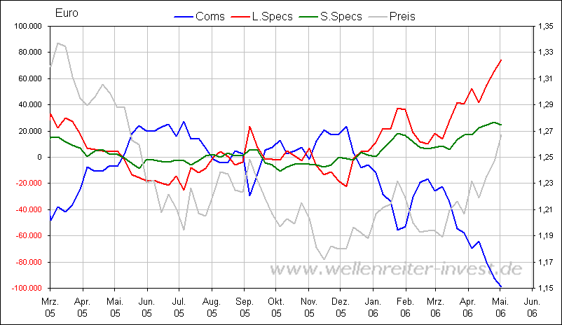 5. Nach den aktuellen COT-Daten (Commitment of Traders Report) sind große Spekulanten und Hedge Fonds (large specs) zurzeit extrem long-Euro positioniert, die Commercials (Firmen, die sich die günstigen Dollar-Kurse sichern wollen) sind jedoch maximal short Euro. Die Schere ist extrem - höher als jemals zuvor in den letzten fünf Jahren.