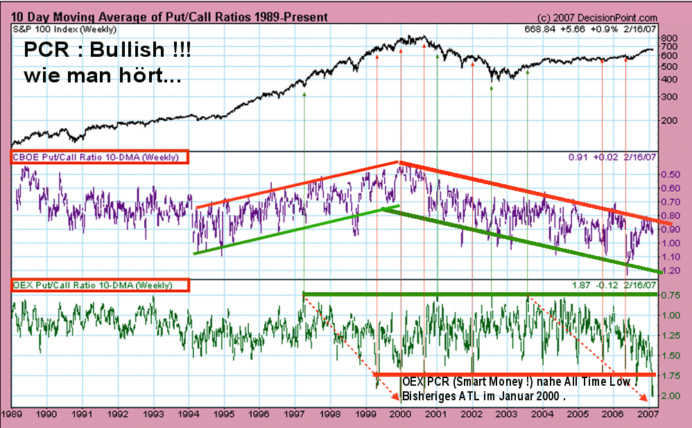 Weiterhin interessant ist, dass in USA die Höhe der Lombardkredite (Margin für Aktienkäufe auf Kredit) bereits wieder so hoch ist wie im Frühjahr 2000. D. h. dass weder bei den Fonds, die voll investiert sind, noch bei den Zockern, die Margin-mäßig am Anschlag laborieren, Kohle zum weiteren Hochkaufen der Indizes vorhanden ist.