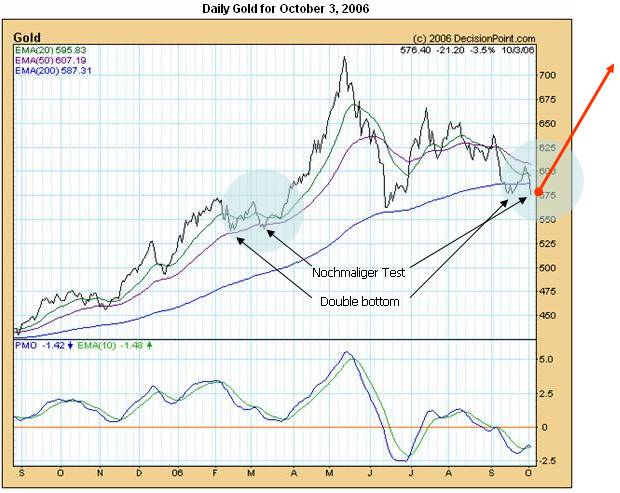 Gold closed today at $576.40 after completion of an A-B-C correction and landing on primary support. Follow the $575 price line from right to left and count the support and resistance price touch points or close calls. This pattern is saying gold would prefer to support at $575 before resumption of the next rally. The negative here is price dropping beneath the 200 day moving average which is very important. Next major gold support under $575 is $550. This is possible but momentum lines in the lower box are forecasting a tentative bottom has appeared. Note the recent, tiny double bottom for gold preceding the last chart rally. This is also a signal confirming price support for gold. December gold futures are actively traded with 194,767 open interest priced at $579.50. Silver Daily October 3, 2006