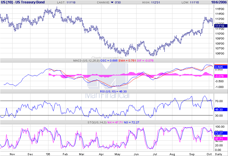 Silver has produced a better looking chart by supporting on the 200 day moving average. Momentum has turned sideways for now and silver recently touched both the 20 and 50 day moving averages demonstrating more recent strength than gold. While there is not quite as much support indicated for silver at its current price, we think it will support and hold. Next lower support for silver is 10.00-10.50. Watch for wider trading ranges for both silver and gold in the forthcoming rallies as volatility increases. December silver futures have open interest of 61,347 contracts priced at 10.885 very close to the 10.80 support price. Crude Oil Daily October 3, 2006