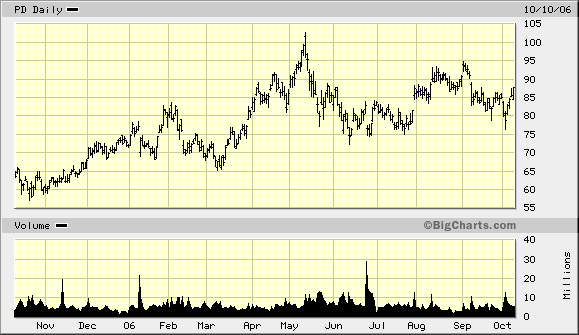 HEUTE steht PD bei 85 und hat ein KGV von nur noch 13. Ein schreiender Kauf, wie es scheint. Doch genau dies ist ein Irrtum. Heute ist PD ein Short! Der Rohstoffzyklus nähert sich seinem Ende, die US-Wirtschaft schwächelt. Es könnte gut sein, dass Phelps Dodge in einem Jahr bei nur noch 50 Dollar steht und ein KGV von 8 hat. Daher ist die Aktie jetzt trotz des viel niedrigeren KGVs KEIN KAUF mehr.