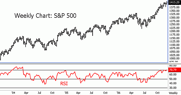 There are also technical signals suggesting the stock indices are due for corrective pullbacks soon. The Relative Strength Index (RSI) overlaid on the weekly charts for the S&P 500 futures and the Dow Jones Industrial Average shows readings that are into technically overbought territory (above 70.00). An examination of recent price history does show that when RSI does move above 70.00 on the weekly charts for these indices, they do experience, at the least, a significant downside price "correction" shortly thereafter.