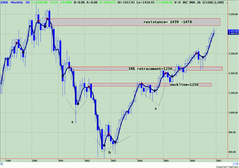 S&P 500. There is a significant resistance zone between 1439 and 1478 that I believe will cap any upside move for 2007.