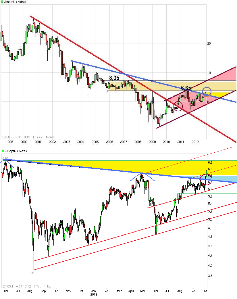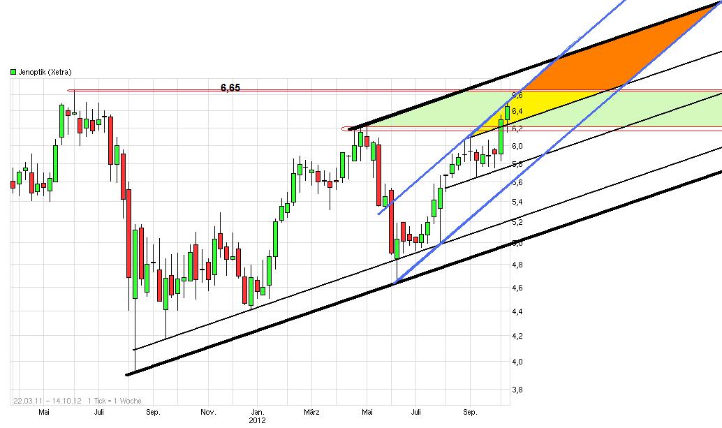 Also die 6,65 dürften mit hoher Wahrscheinlichkeit kommen. Zuletzt hatte man nochmal einen kurzen Pullback an die 6,20 gemacht, ist dann aber wieder schnell nach oben abgedreht. Von daher sehe ich die Chancen für Kurse von 6,65+x weiterhin als sehr gut an solange man nicht nachhaltig wieder klar unter 6,20 läuft. Im übrigen ist die 6,65 nur interesssant, weil es der nächsthöhere horizontale Widerstand ist. Ich erwarte aber, daß man noch weiter hochläuft bis mindestens zur oberen dicken schwarzen Trendkanalbegrenzung. So eine 7 vor dem Komma sähe auch viel schöner aus als nochmal die 5 davor. Ich hoffe die nächsten Zahlen/Prognosen kommen entsprechend überzeugend, um den Schub aufrechtzuerhalten.