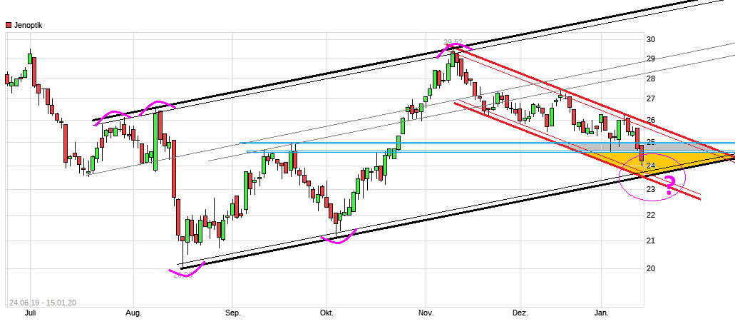Leider hat der mögliche Abprall an der seit Mitte August steigenden Trendlinie nicht stattgefunden (und somit auch kein Long-Einstieg), da der unerwartete Verkaufstop der Verteidigungssparte dem Ganzen einen Strich durch die Rechnung machte. (Ad hoc: JENOPTIK AG: Jenoptik stoppt Verkaufsprozess von VINCORION - Freitag, 17.01.2020 -https://www.ariva.de/news/...optik-stoppt-verkaufsprozess-von-8107790). Der CEO klang ja noch im November zuversichtlich für den Verkauf ( 12.11.2019 - https://www.ariva.de/news/...rkauf-von-militaergeschaeft-2020-7967268 Jenoptik -Vorstandschef Stefan Traeger rechnet im kommenden Jahr mit dem Verkauf der Militärtechniksparte .... "Wir sind da eigentlich gut unterwegs.") und es hätte dem Kurs Rückenwind gegeben, wenn der Verkauf zu einem guten Preis jetzt über die Bühne gegangen wäre. Leider ist dem nicht so. Stellt sich die Frage, ob Jenoptik viel zu hohe Vorstellungen hatte oder die Bieter den Wert nicht hinreichend gewürdigt haben. Wie dem auch sei, das erhoffte Geld aus dem Verkauf kann nun nicht genutzt werden für eigentlich angedachte Zukäufe für andere Sparten. Bringt also die ganze ursprünglich angedachte Strategie jetzt durcheinander. Und ich habe auch das Gefühl, daß hier gewissen Leute vorher schon von dem Scheitern wußten. Denn schon Tage vor der Verkündung ging plötzlich das Volumen schon hoch und der Kurs newslos runter. Jetzt ist der Chart erstmal angeschlagen und der MACD hat im Weekly auch noch frisch nach unten gekreuzt.