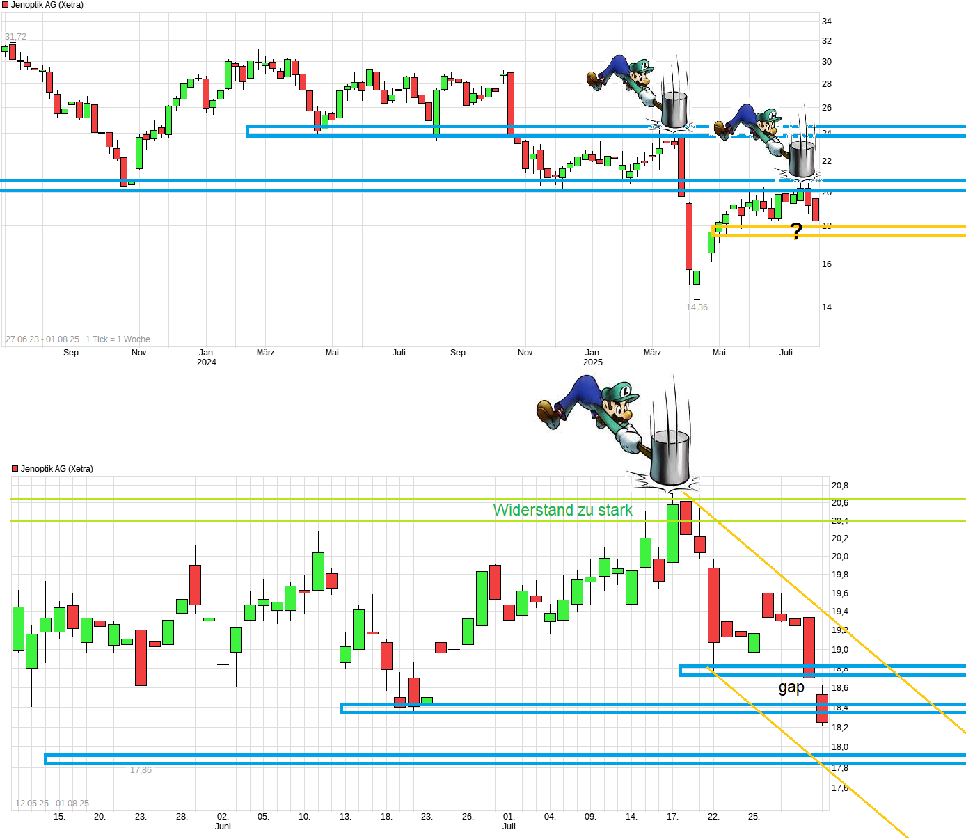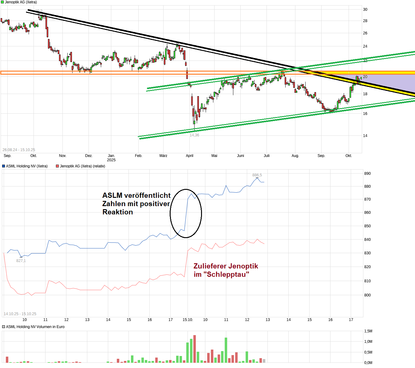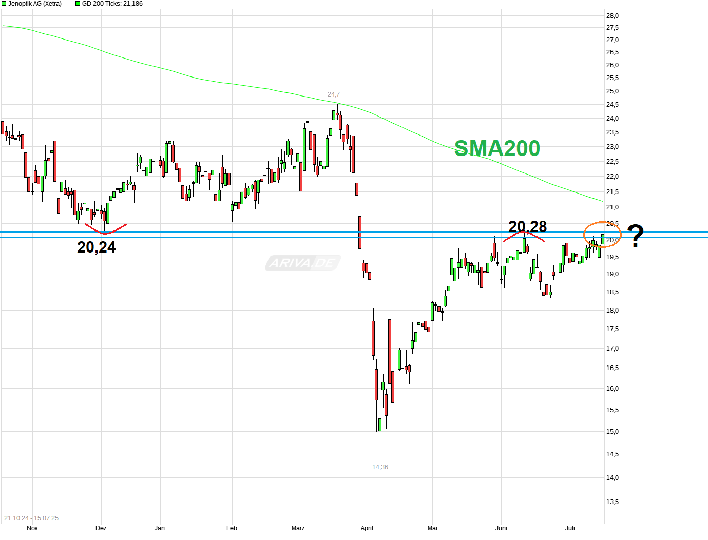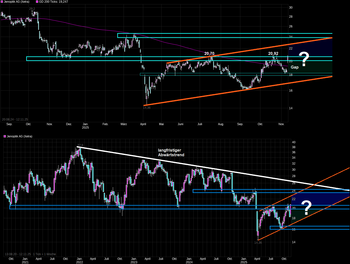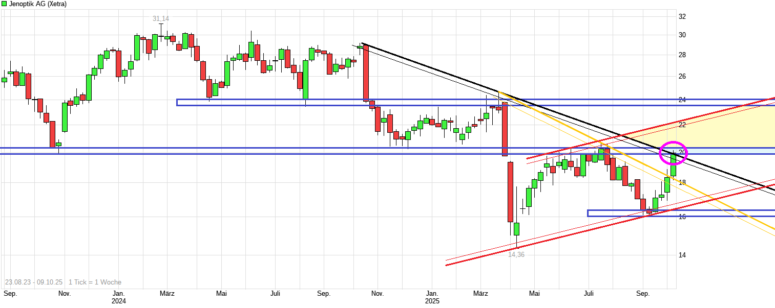 Das erklärt die zuletzt gesehene brutale Underperformance der Jenoptik Aktie gegenüber Peers wie Aixtron oder PVA Tepla, die sich zuletzt sehr deutlich erholen konnten und mittlerweile kurz- mittel- und langfristig schöne Aufwärtstrends aufweisen, während Jenoptik zeitgleich unter sämtlichen relevanten SMAs notiert.