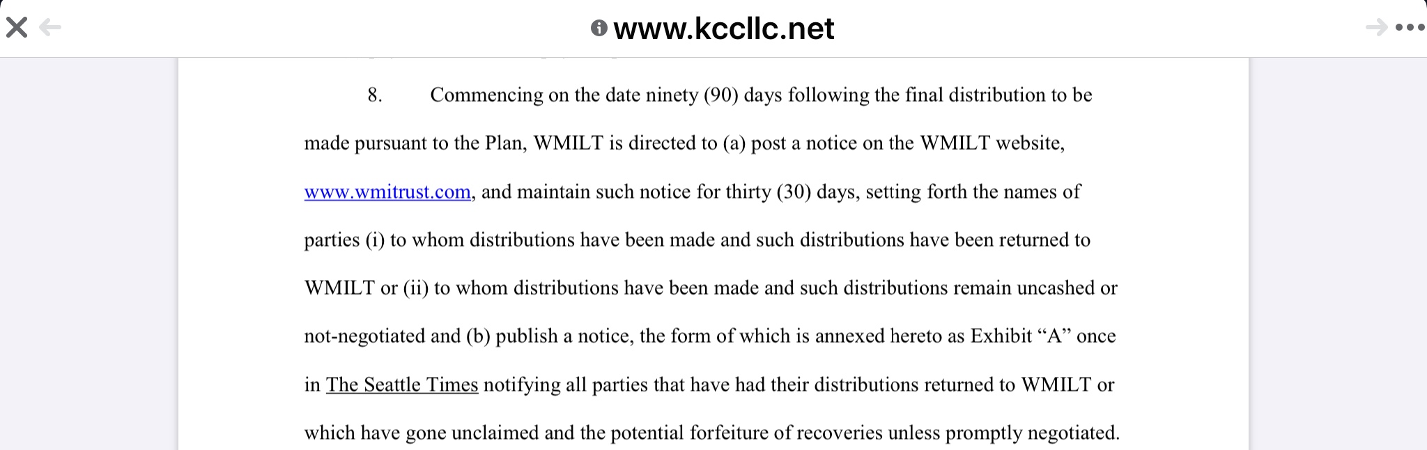 Nach dem Ausschüttungsdatum wird er 90 Tage warten, ob auch alles angekommen ist bzw. die Schecks von über 6000 Begünstigten zurückkommen. Dann wird er die "unzustellbaren" Begünstigten in der in Seattle Times und 30 Tage lang auf der Homepage des WMILT auflisten, damit sie Zeit haben, sich beim WMILT zu melden... nach diesen 30 Tagen (evtl. auch 60 Tage Gesamtfrist) schlägt der WMILT vor, die nicht in Anspruch genommenen Gelder für wohltätige Zwecke zu spenden (Punkt 31+59)