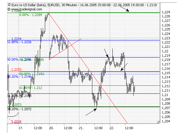 Diese Nachricht hatte jedoch trotzdem Einfluss auf den Euro, er fiel wieder. Das ist die Gegenbewegung nach dem deutlichen Anstieg und dem Bodenversuch des Euros. Diese Gegenbewegung ist nun Anzeiger, ob es wirklich ein Boden ist, oder ob es noch eine Ebene tiefer gibt.