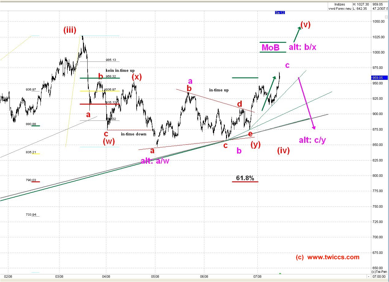 Auch das 61.8% Retracement bei 958.x konnte überwunden werden und so ist der Gefahr eines ZigZags down ab 1027.30 aus dem Wege gegangen worden.