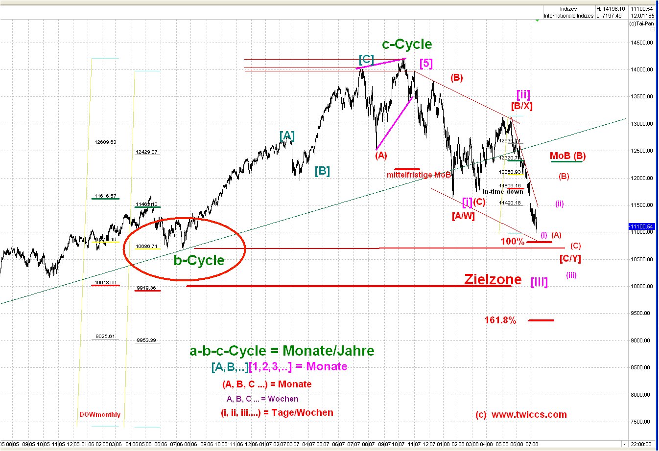 In der rosa Zählung beendete der DOW seinen Anstieg mit einem EDT deren [5] bei 13962 endete. Im November erzeugten die letzten 3 Monatscandle einen "evenening star". Ein erster Impuls [i] führte den DOW auf 11758/11634, der sich eine [ii] bis 13136 anschloß. Das für diese Zählung zwingend erforderliche in-time down ist erfolgt.