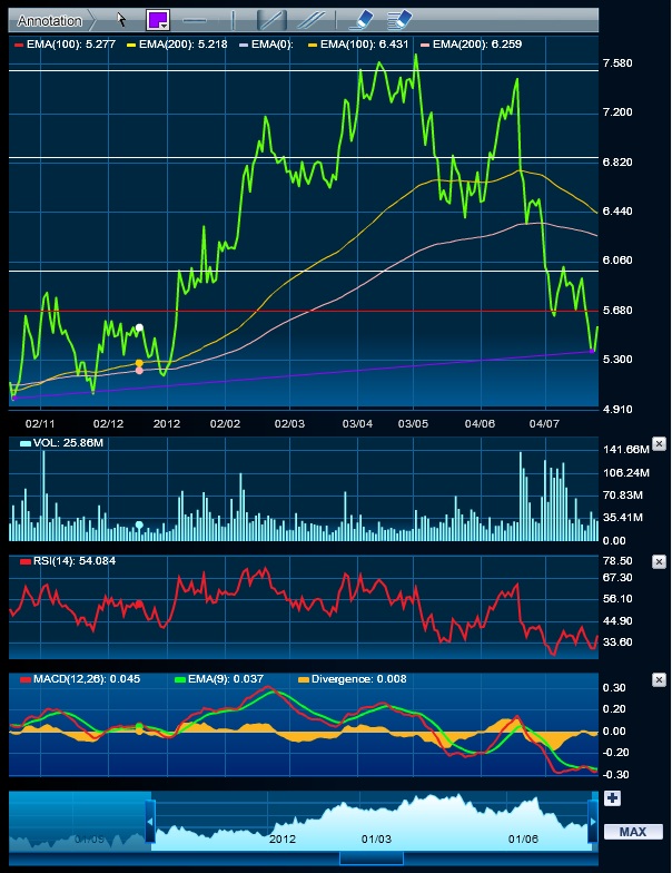 Sehen wir uns dann den 1 Jahres-, 3 Jahres- und 5 Jahreschart an so finden wir die nächste relevante und eher stabile Unterstützung aus dem Chart bei 37Cent etwa vor einem Jahr, noch weiter unten befinden wir uns Anfang 2009 bei einem Minimalkurs von man höre und staune 13 Cent.