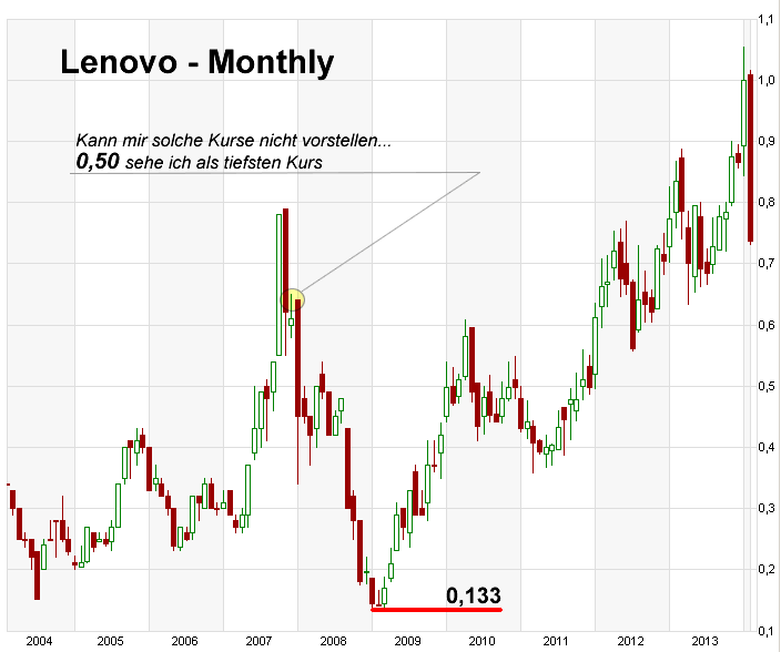" Der Kurs bei Lenovo ist einfach zu ehrlich, da spiegelt sich wirklich alles wieder, deshalb geht's jetzt auch weiter runter, zum Leidwesen der bereits Investierten, die sich dann damit trösten müssen auf mehrere Jahre investiert zu sein."