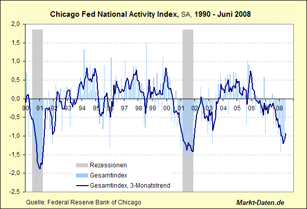 Chicago (aktiencheck.de AG) - Die Federal Reserve Bank of Chicago ermittelte für Juli 2008 einen Rückgang beim National Activity Index. Demnach hat sich der Chicago Fed National Activity Index (CFNAI) auf -0,67 Zähler verschlechtert, nach revidiert -0,59 (vorläufig: -0,60) Zählern im Vormonat.