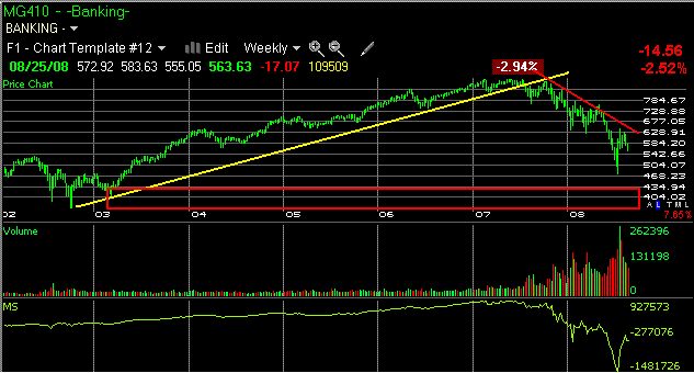 I write about the financial and banking sector quite often in my columns, and I have been warning investors to stay away from this area of the market since June 2007. Over the sector's steep drop over the past year, there has been plenty of bottom calling on the way down. I believe the recent sharp "V" move up was likely sparked by short-covering, and that does not usually set a stage for a major move higher. You can see on the charts that the move failed soon after and now looks like it's at least headed to test those lows. A more detailed look is in order, which I will do in a bit, but right now, I'm very pessimistic about this sector.