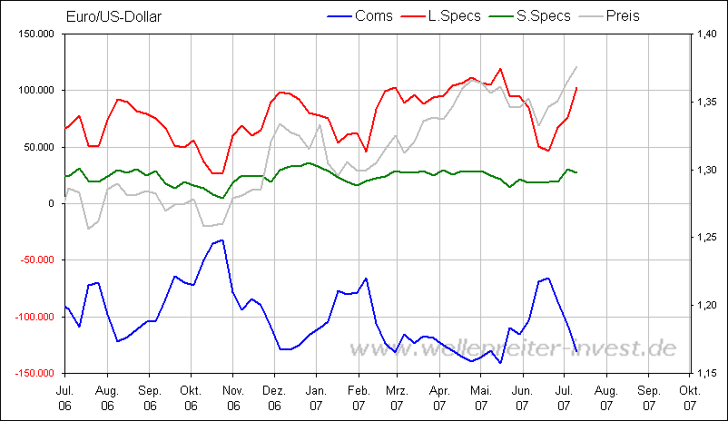 Während das "Dumb money" (Trader, Zocker) charttechnische Kapriolen schlägt und mit immer absurderen "Kurszielen" oberhalb 1,50 jongliert, ist das "Smart money", zu dem auch Großbanken und Zentralbanken zählen, bereits dabei, zu diesen Sonderangebots-Kursen Dollars zu AKKUMLIEREN: Es findet eine Distribution von schwachen in starke Hände statt. Zum Smart money zählen auch die Commercials (Coms), die im Futuremarkt die Gegenposition zu den Specs (Spekulanten) einnehmen (COT-Chart unten).