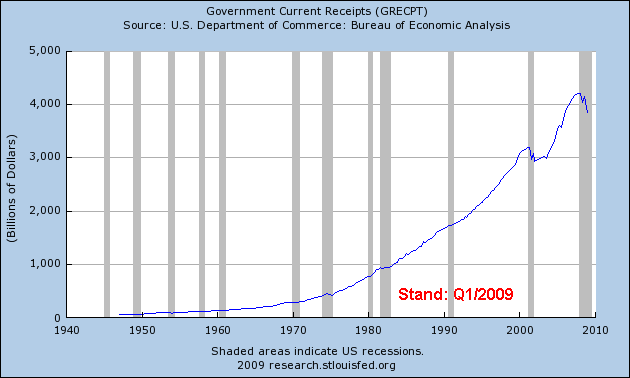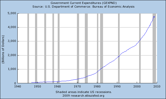 1930 hatten die USA noch einen ausgeglichenen Haushalt. Bis 1934 stieg die Gesamtverschuldung auf 264 % des GDP. 2002 waren es bereits 295 %. Die aktuelle Schätzung liegt bei 420 %. Das Kernproblem stellt die sich immer weiter öffnende Schere zwischen Staatsausgaben und -einnahmen dar. Der folgende Chart zeigt die Ausgaben des Bundes mit Stand Q1/2009 (ohne "off budget items", für die aktuell noch etwa 1000 Mrd. hinzugerechnet werden müssten).