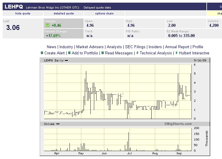 Die jüngsten Rallyes in Pleiteaktien wie Arcandor (in USA bei der bankrotten Lehman, Chart unten) sprechen ebenfalls Bände. Die Dax-Rallye ist mMn zu einem erheblichen Teil ein Short-Squeeze - vergleichbar der Hype-Rallye von Januar bis März 2000. Die "Kaufpanik", die laut # 49222 nun noch kommen soll, ist mMn bereits in vollem Gange, ich würde sogar sagen, sie liegt in den letzten Zügen.
