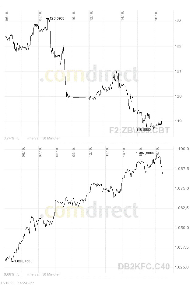 Seit ein paar Tagen ist die klassische Relation zwischen Longbonds und Aktien wieder hergestellt: wenn die Aktien steigen, sinken die Longbonds, und umgekehrt. Das gilt sowohl intraday als auch für die Tage.