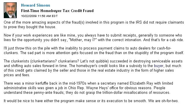 Bei der Hauskaufzulage mussten die Empfänger nicht mal beweisen, dass sie das Haus überhaupt faktisch gekauft haben. Dies ist wohl einer der Gründe, warum die Zahl der "pending sales" (per Unterschrift besiegelte Kaufverträge) seit Monaten wesentlich höher ist als die Zahl der letzten Endes praktisch abgewickelten Verkäufe. Offenbar streichen viele "Käufer" einfach nur die 8000 Dollar ein.