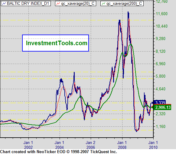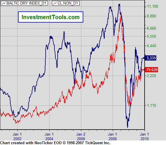 Hier sieht man schön wie im Janaur 2008 der weiterhin steigende Ölpreis den BDI deutlich hochzieht, obwohl durch die konjunkturelle Schwäche sicherlich "real" bzw. "ohne Öl" ein Rückgang des BDI stattgefunden haben muss.