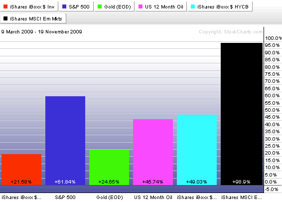 The big winners since the stock market bottomed in March have been emerging-markets stocks, up a stunning 99% on the iShares MSCI EAFE Index ( eem - news - people ). Corporate junk bonds are up 50% as measured by the iShares iBoxx High Yield Corporate Bond ( HYG - news - people ) ETF, while the iShares iBoxx Investment Grade Corporate Bond ( LQD - news - people ) fund is up a comparatively modest 21%.