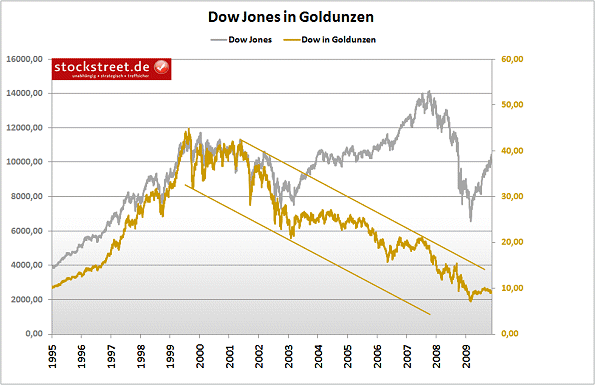 Und genau das ist es, was dieser Dow Jones in Goldunzen dargestellt eigentlich belegt. Es zeigt sich, dass all die niedrigen Zinsen, die Konjunkturprogramme, die Steuererleichterungen in den USA nichts, wirklich nichts erreicht haben. Die Krankheit wütet seit dem Jahr 2000 in den USA einfach weiter. Dieser im Chart erkennbare Abwärtstrend ist damit der ehrlichste Blick auf die Börse.