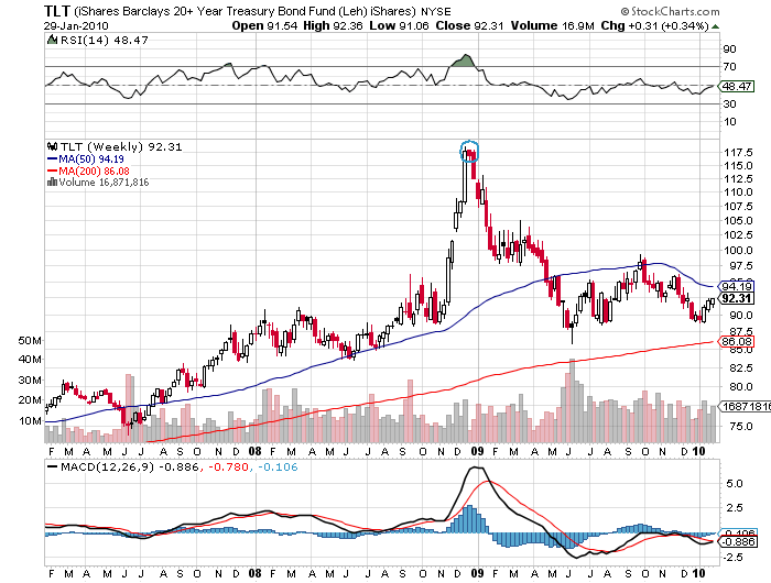 Im Herbst-2008-Aktiencrash schoss TLT wegen Risikoaversion steil nach oben. Man hatte im Dezember 2008 etwa zwei Wochen Zeit, die Gewinne am Top zu realisieren. Im September 2008 stand TLT bei ca 90 Dollar, im Dezember am Top bei ca. 118. Der Kursgewinn lag daher bei ca. 30 %.