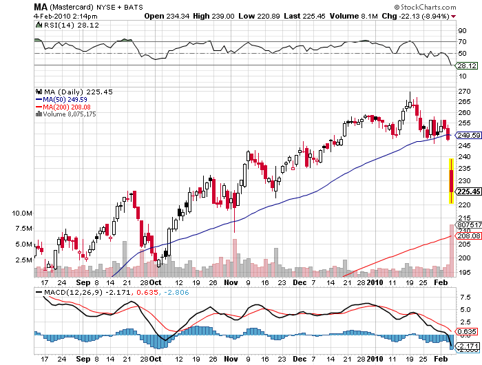 BOSTON (MarketWatch) -- MasterCard Inc. shares fell heavily along with the broader financial sector Thursday after the credit-card network reported disappointing quarterly earnings and said the U.S. consumer remains under pressure.